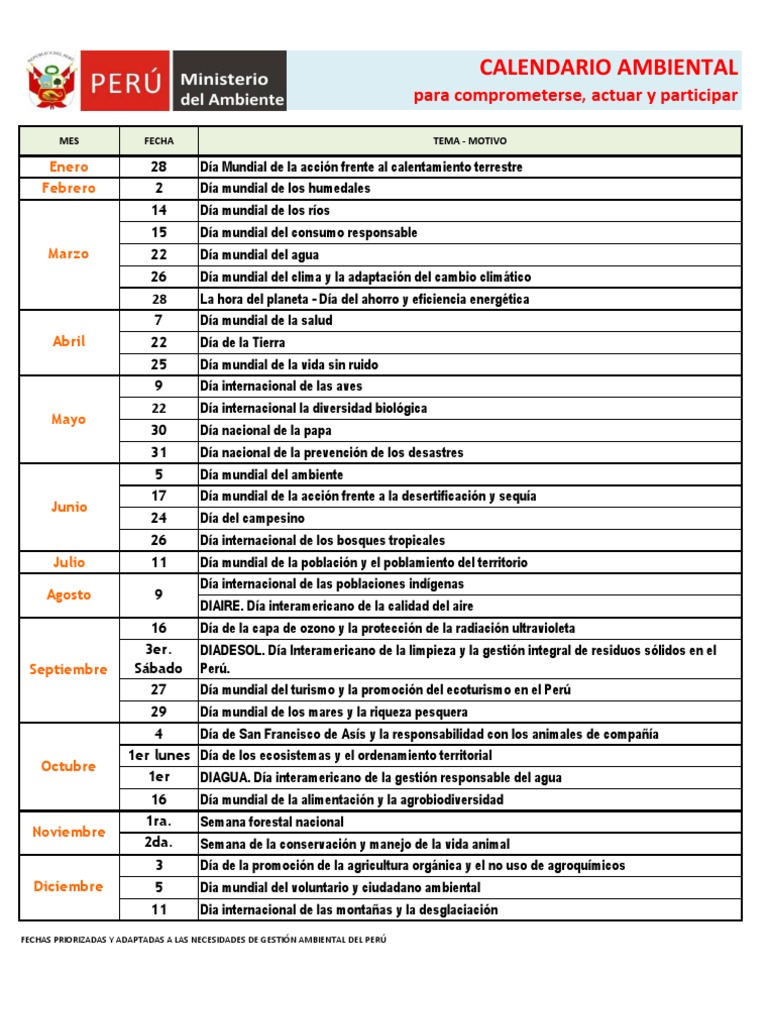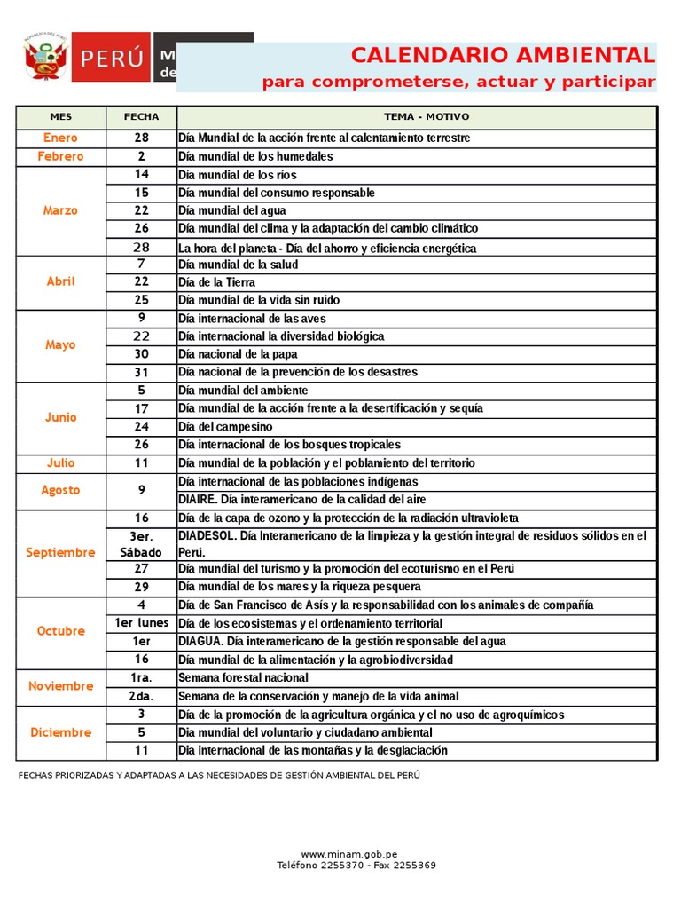 Minam Calendario Ambiental Peruano 2019 Pdf Peru Tierra