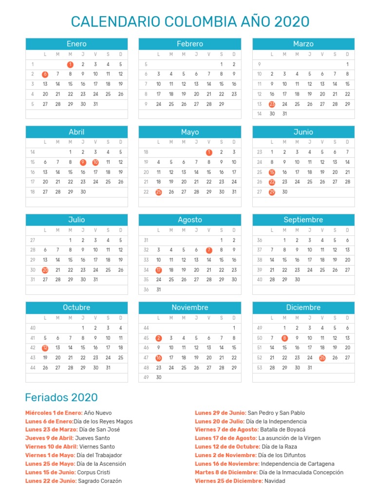 Calendario De Colombia 2020 Con Festivos